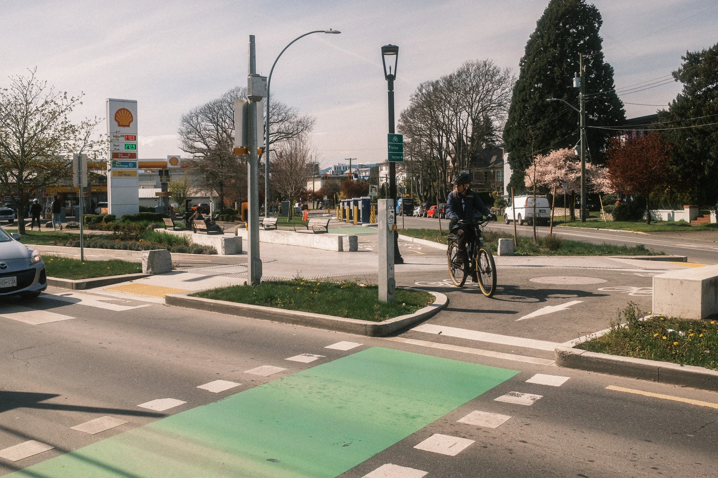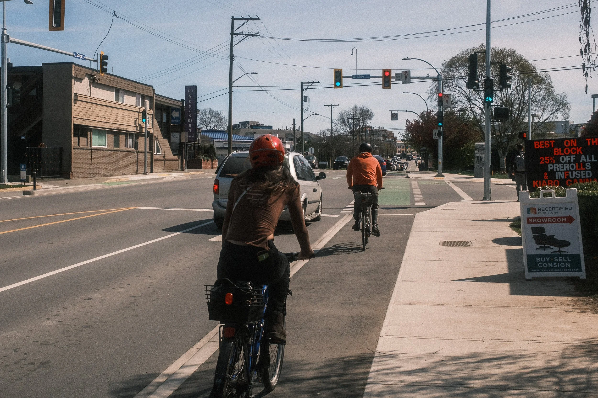 From Harbour Road, you can head across the Selkirk Trestle… Not fun on those small Brompton wheels… And head up to Gorge Road, one of the city’s most recent bike protected lanes. There’s some interesting elements along that corridor, including continuous sidewalks, but I really like that we have locations with separate right-turn lanes, separate right turn signal phases, and no-right-turn-on-red, allowing people on bikes to go through this intersection with less chance of conflict.